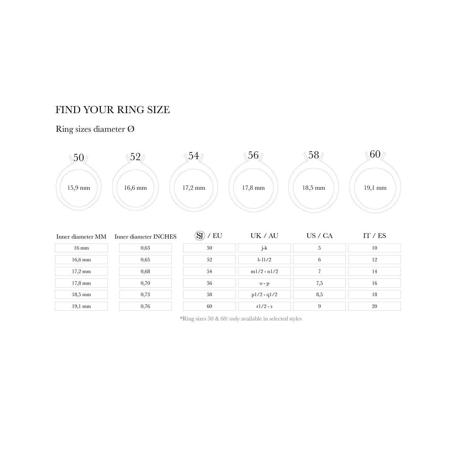 When buying rings online, choose your ring size from a chart. The experience can be cumbersome, especially if your purchase is significant, such as an engagement ring or couple rings to surprise your loved one. Online ring size guides vary around the world. SJJ ring sizes are based on the inner circumference of the ring and range from 48 (diameter: 15.3 mm) to 60 (diameter: 19.1 mm). You can easily identify the corresponding UK or US size from the chart.