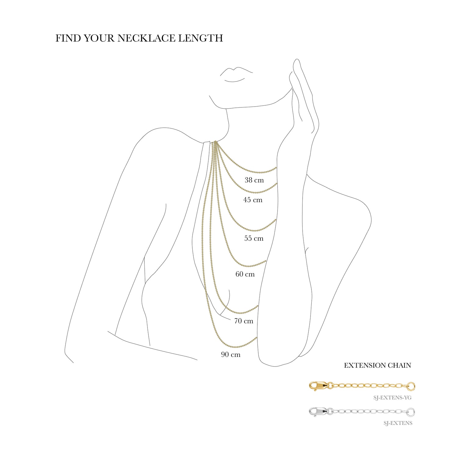 To make it easier for you to find the right length, we have created an illustration showing how long a necklace of a specific length will be. Please note that the length may vary depending on your size and shape.