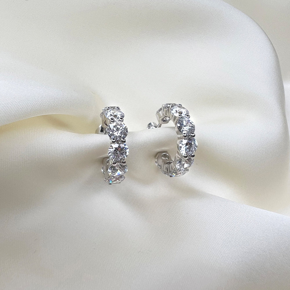 Earrings made of 925 Sterling silver with rhodium, polished surface with facet cut white zirconia.