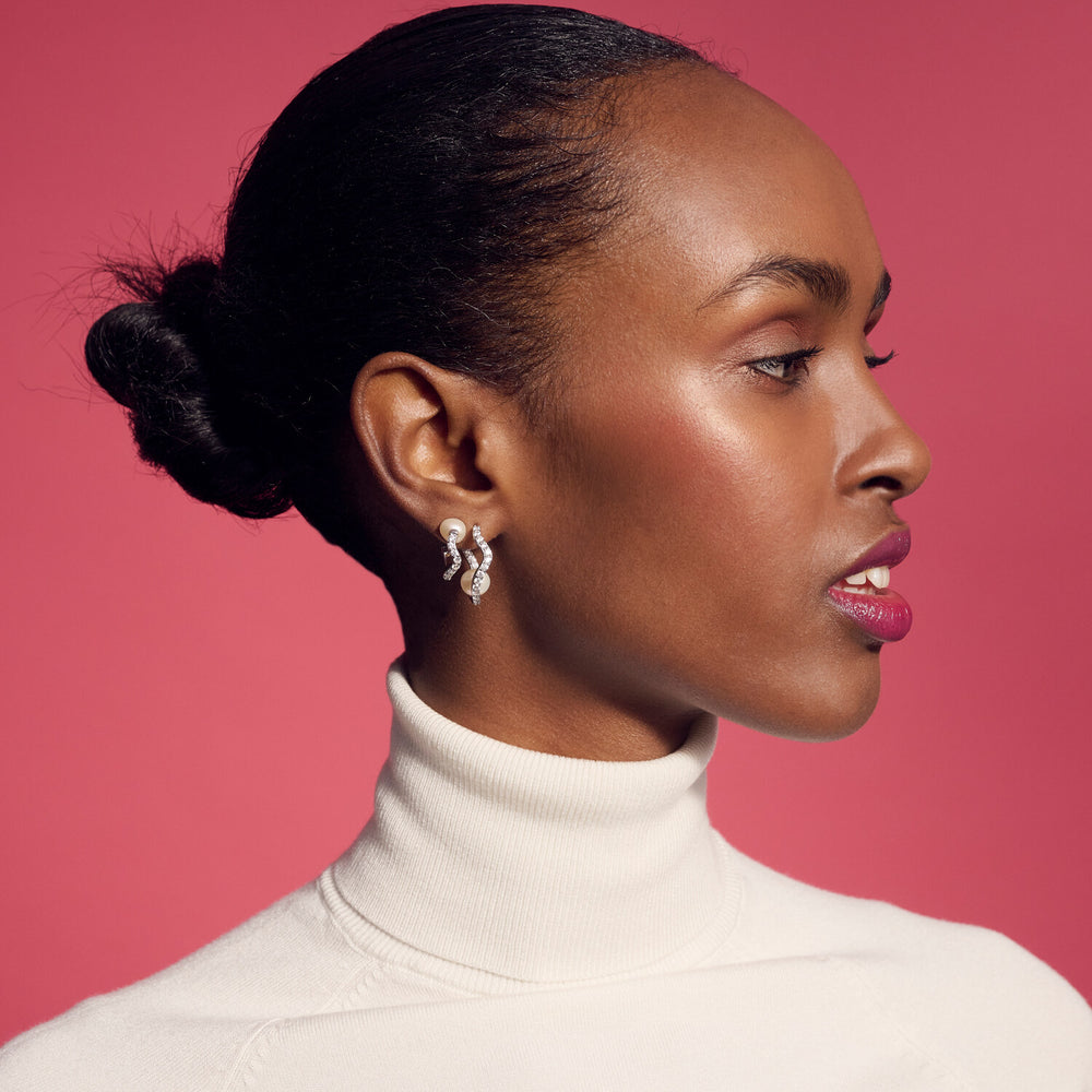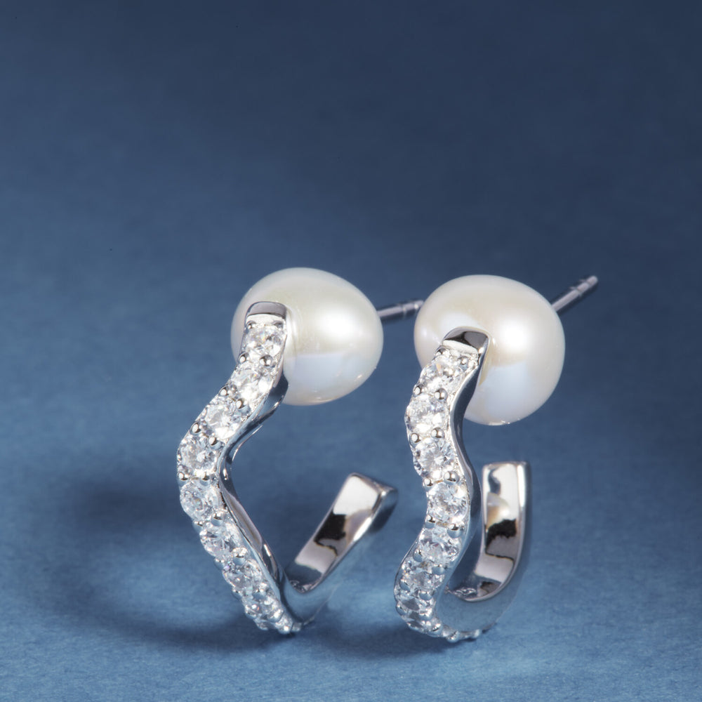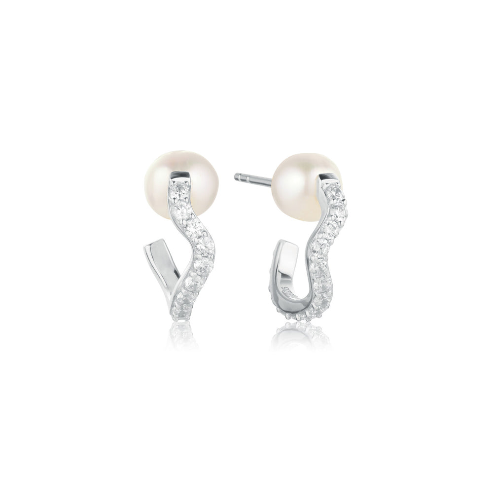 LIMITED EDITION Earrings made of 925 Sterling Silver with rhodium, polished surface, handset with facet cut white zirconia and lustrous freshwater pearl.
