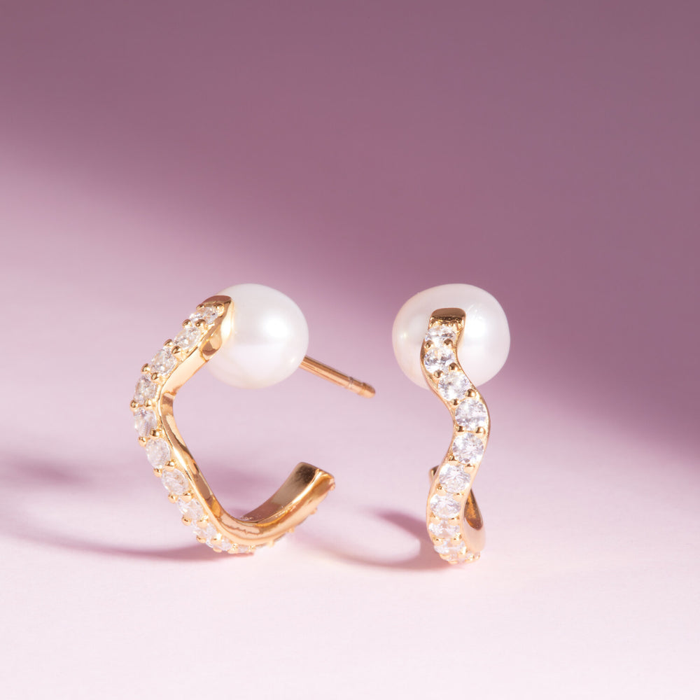 Earrings made of 18 karat gold plated 925 Sterling silver, polished surface, handset with facet cut white zirconia and lustrous freshwater pearl.