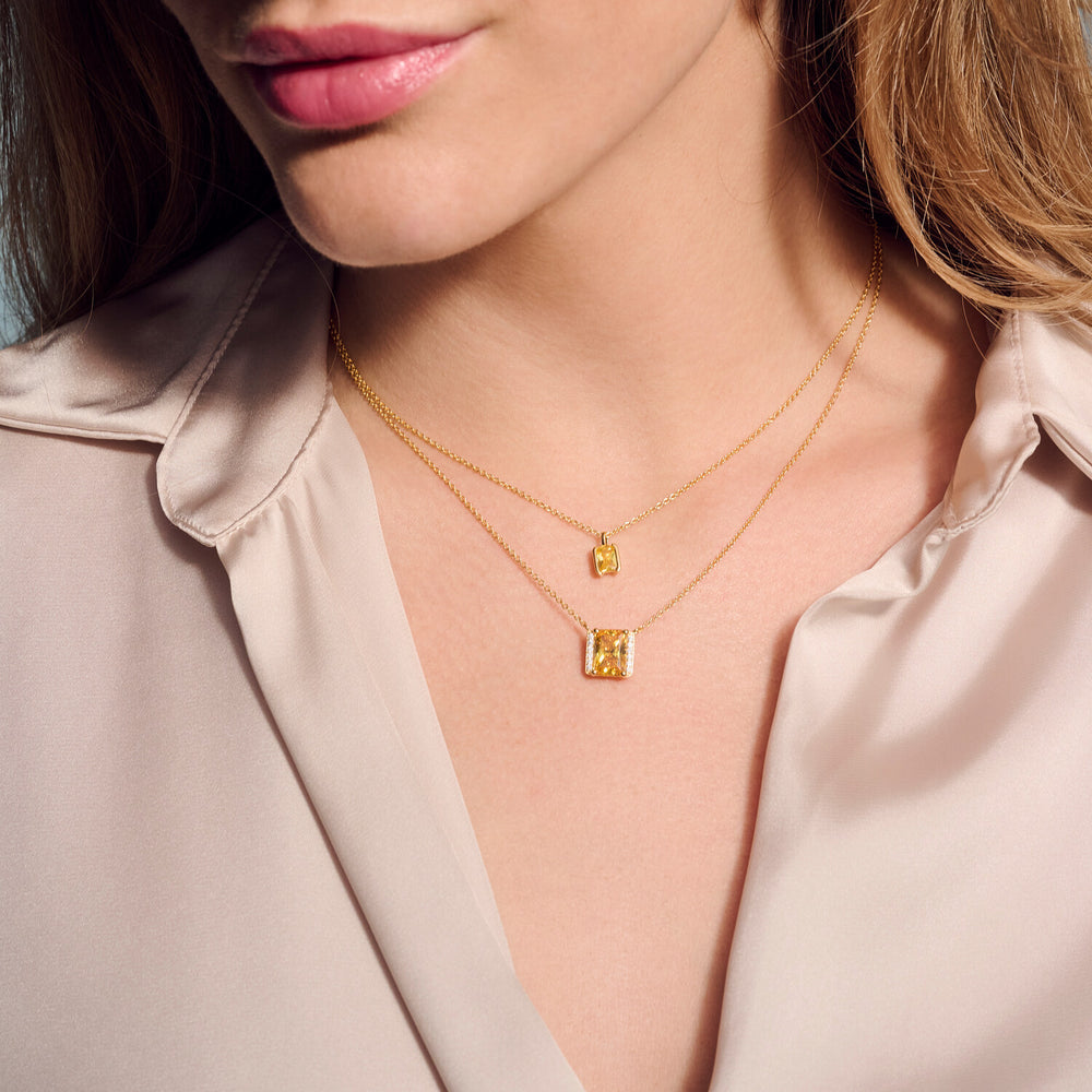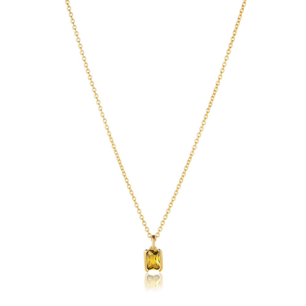 Necklace made of 18 karat gold plated 925 Sterling silver, polished surface, and handset with emerald cut yellow zirconia.