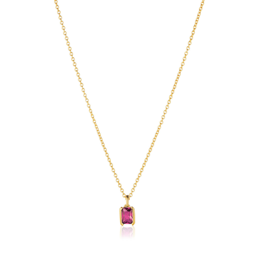 Necklace made of 18 karat gold plated 925 Sterling silver, polished surface, and hand set with emerald cut pink zirconia.