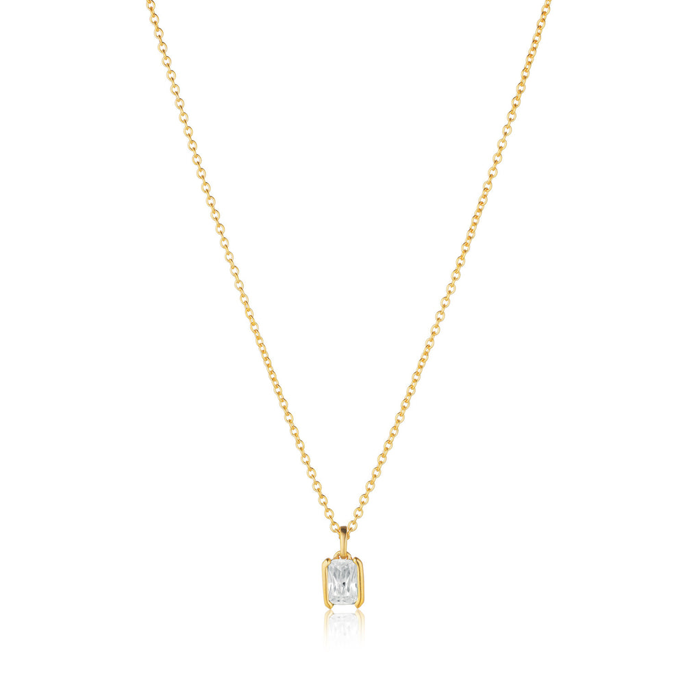 Necklace made of 18 karat gold plated 925 Sterling silver, polished surface, and hand set with emerald cut white zirconia.