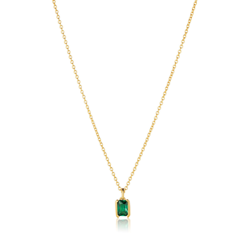 Necklace made of 18 karat gold plated 925 Sterling silver, polished surface, and hand set with emerald cut green zirconia.