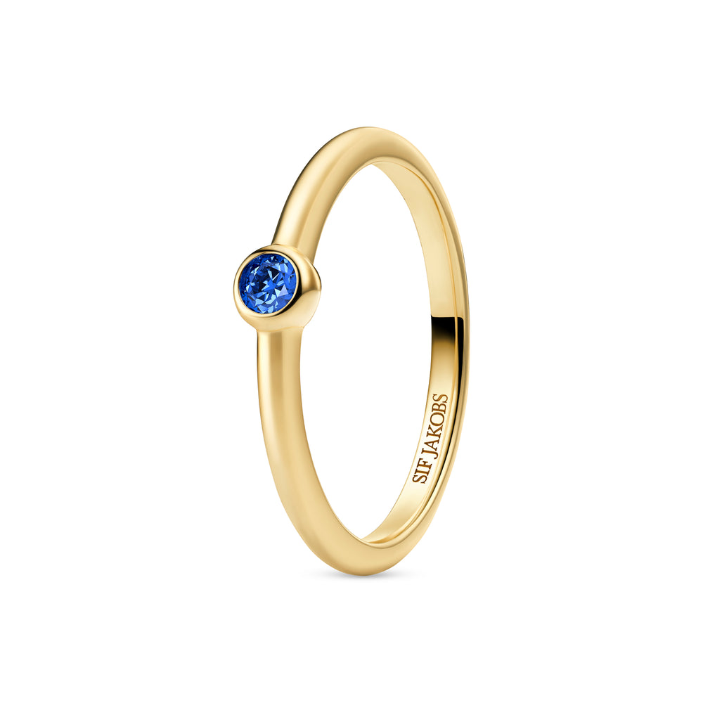 Ring made of 18 karat gold plated 925 Sterling Silver, a polished surface, and handset with facet cut blue zirconia.