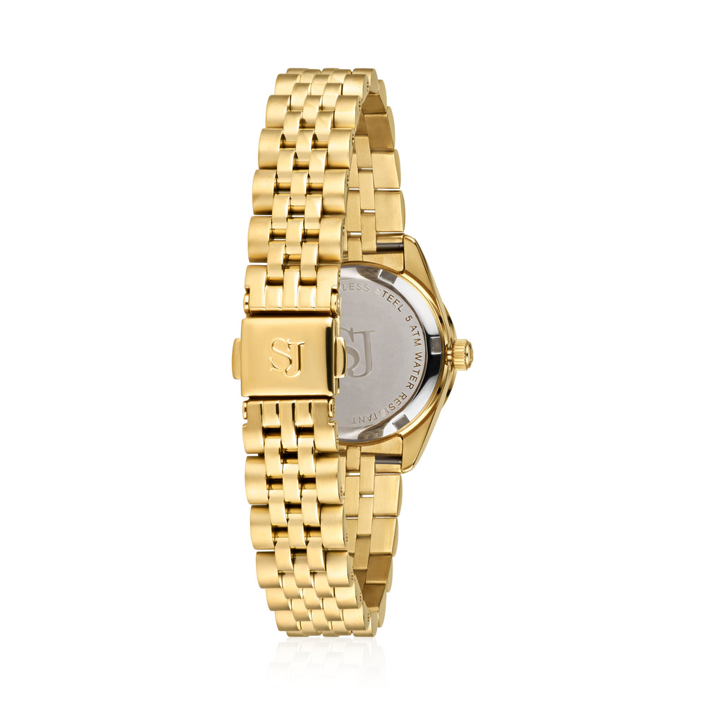 Watch made of gold plated stainless steel, a polished and brushed surface, with sapphire glass and a white dial decorated with white zirconias
